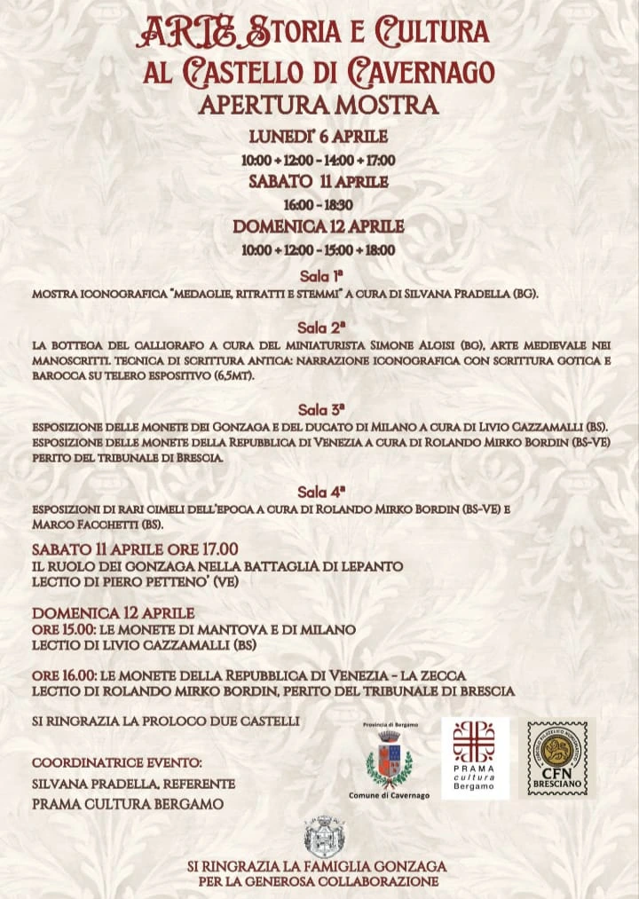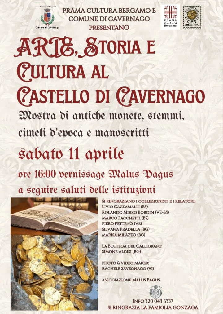 Il Circolo Filatelico Numismatico Bresciano vi invita i giorni 6, 11 e 12 aprile alla rassegna di conferenze e mostre dal titolo: “Arte, Storia e Cultura al Castello di Cavernago – mostra di antiche monete stemmi cimeli d’epoca e manoscritti” presso il Castello di Cavernago, in via castello 1, Cavernago (BG).