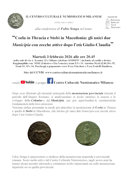 Il Centro Culturale Numismatico Milanese vi invita martedì 3 febbraio 2026 dalle ore 20.45, alla conferenza su “Coela in Thracia e Stobi in Macedonia: gli unici due Municipia con zecche attive dopo l’età Giulio-Claudia” a cura di Fabio Songa. Presso la sede del Circolo, via Kramer 32 a Milano (citofonare SEIDIPIU’, la sala conferenza è in fondo al cortile a destra) o in videoconferenza.